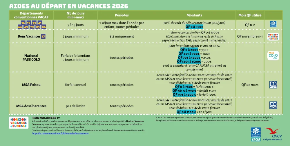 Allocataires CAF 17, sachez que votre département vous offre un « bon vacances » via le dispositif « Horizon Vacances Jeunesse » prenant en charge une partie de vos séjours ! Cette aide s’ajoute aux autres et vous pouvez en bénéficier sur plusieurs séjours, uniquement sur les séjours d’été.