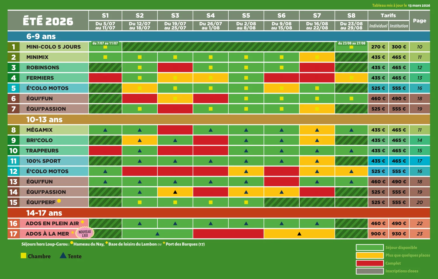 Merci de consulter le tableau de remplissage et de vérifier la disponibilité par date et âge d’enfant.